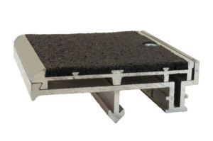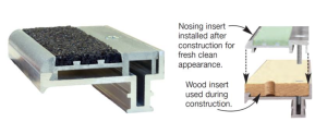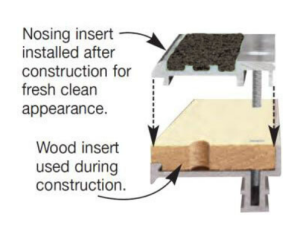 Two Component (Replaceable) Nosings in Supergrit® and Spectra® provide fast, easy replacement with great aesthetics and durability. The premium quality construction of these nosings offers maximum durability with no clatter and an architecturally clean design. Non-combustible nosings provide secure anchorage in matching or contrasting color decor for steel pan or poured concrete steps. Nosings can be furnished with disposable wood insert for use during the construction phase. After construction nosing inserts are installed for a fresh, clean appearance.