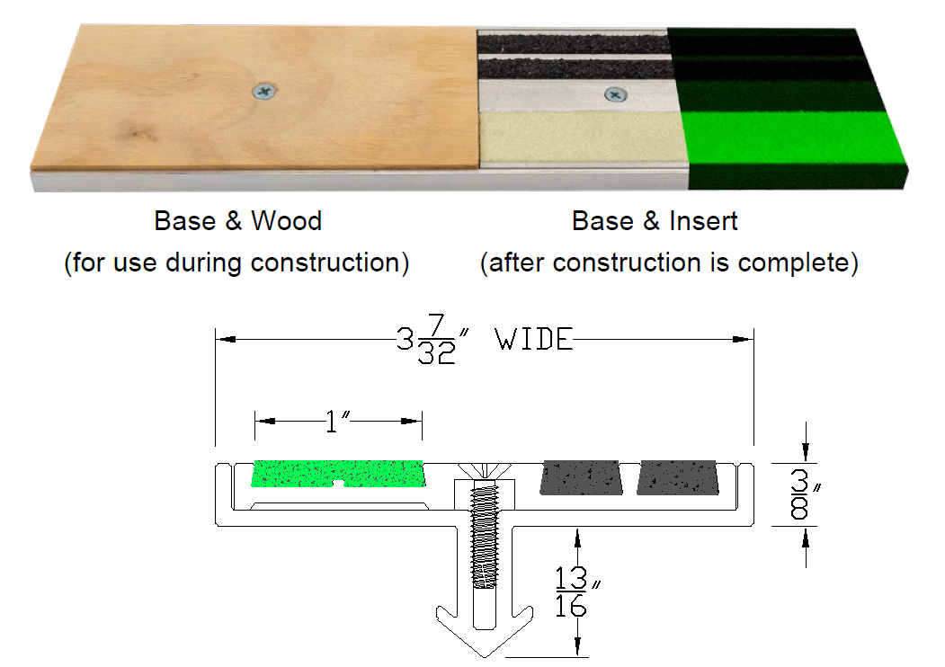 Two Component (Replaceable) Nosings in Supergrit® provide fast, easy replacement with great aesthetics and durability. The premium quality construction of these nosings offers maximum durability with no clatter and an architecturally clean design. Super bright Photoluminescent (glow-in-the-dark) anti-slip stair tread that meets 2015 IFC code compliance. Nosings can be furnished with disposable wood insert for use during the construction phase. After construction nosing inserts are installed for a fresh, clean appearance.